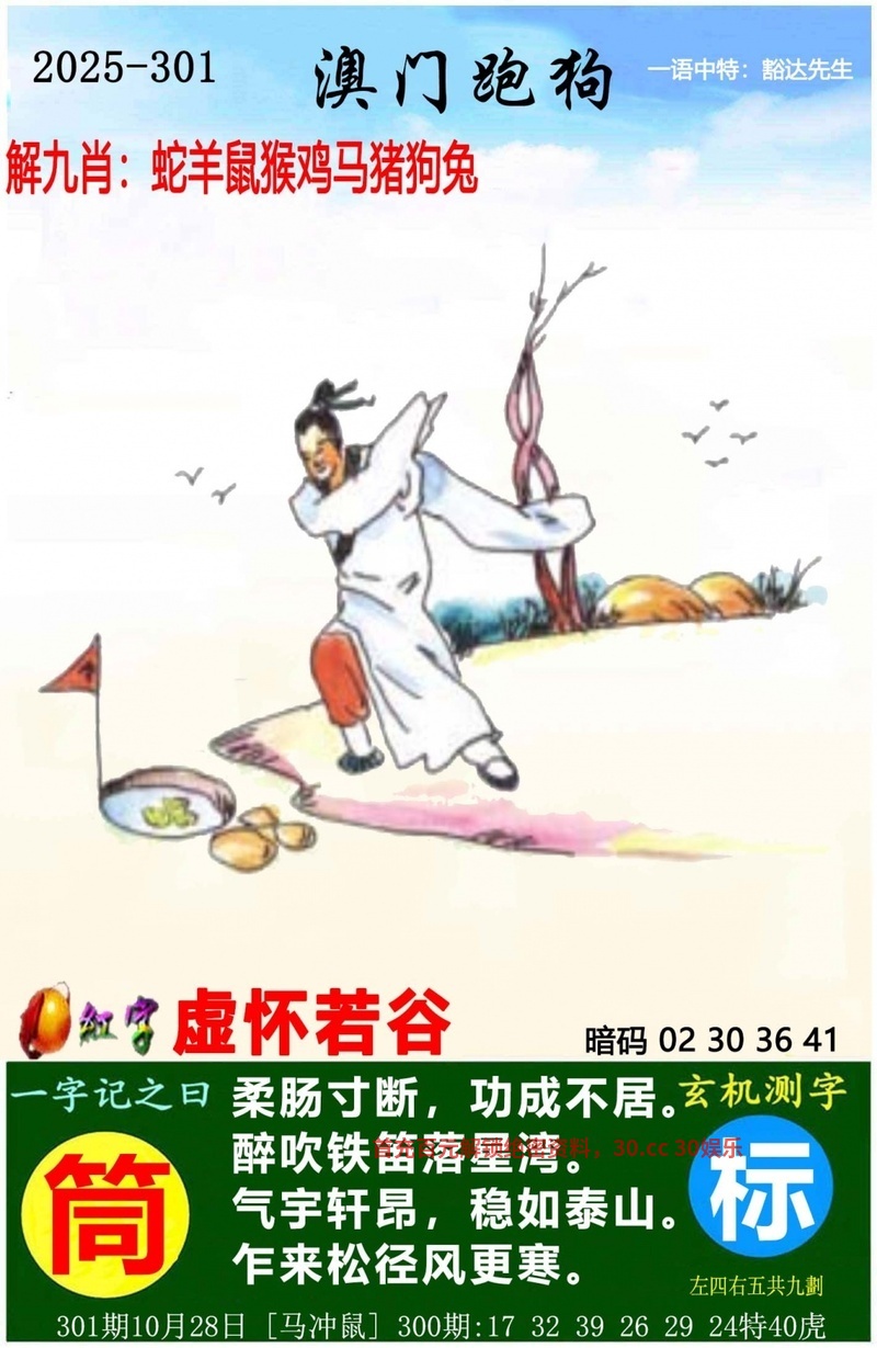 304期一字記之曰:【坐】金銀財足:坐對空林,靜滤俗音,览清净常行允迪。浮生雜事,無須問津,十五学剑北击胡。玄機測字:《哧》 解:浮生雜事,無須問津,无边生肖:鼠牛虎兔马羊。 综合取肖:鼠牛虎兔马羊 ![]() |